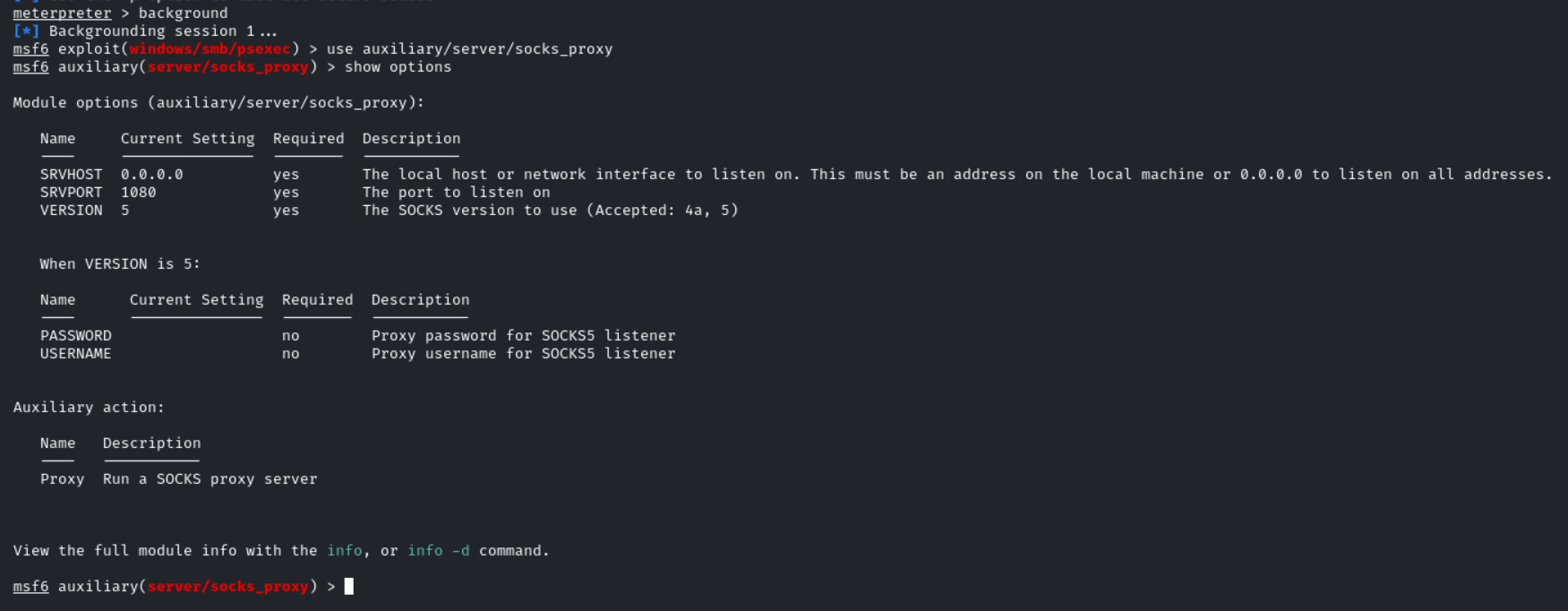Now, let's run the Metasploit socks proxy auxiliary server module on port 9050.