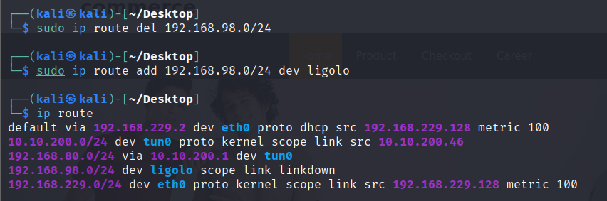 Our next step is to add an entry to the routing table so Ligolo can route traffic through the tunnel and reach the target network. To do this, we can use the command: