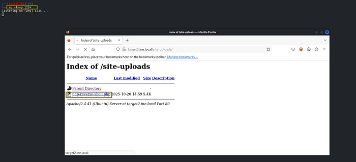 Now open up the directory in the web browser again and click on the php-reverse-shell.php file. Then, head over to your Netcat listener and we have obtained access.