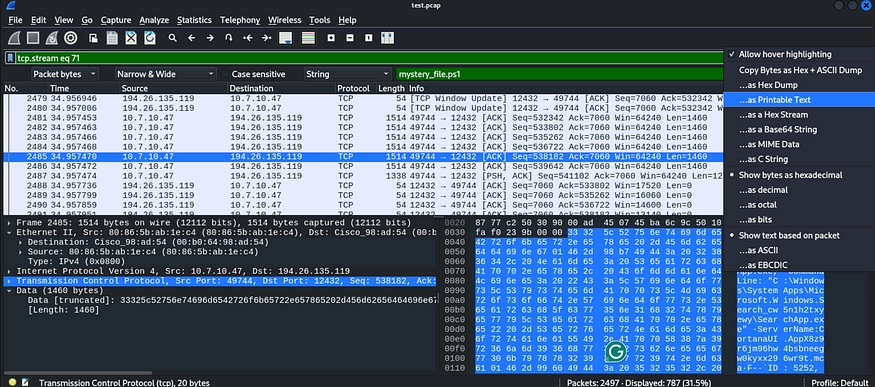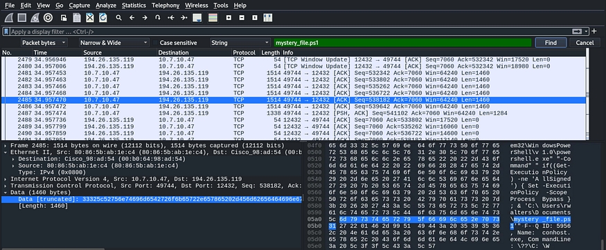 Change the Display Filter to String and enter the file name you are looking for: mystery_file.ps1. Then, search using Packet bytes on the left side of the Find functionality and click on find.