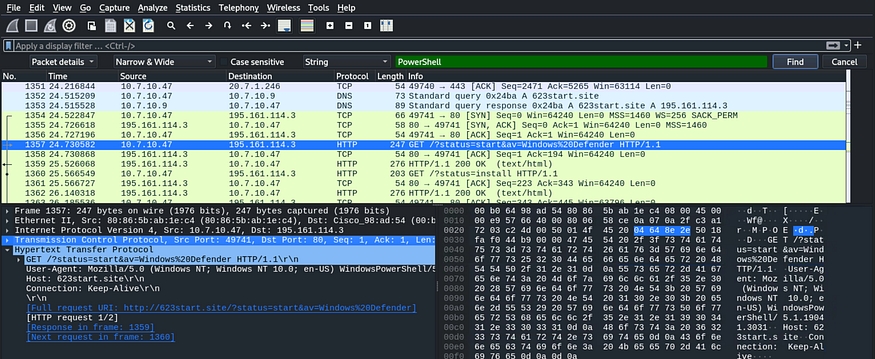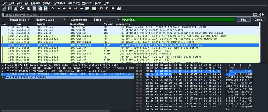 To find this, press CTRL+F to search. In the String parameter, type PowerShell, and search using Packet Details on the left side of the Find functionality.