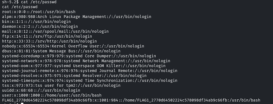 Now, moving on to flag 1. As the question suggests, we need to enumerate the file that stores user account details. In Linux, user account information is stored in the /etc/passwd file. Let's read its contents.
