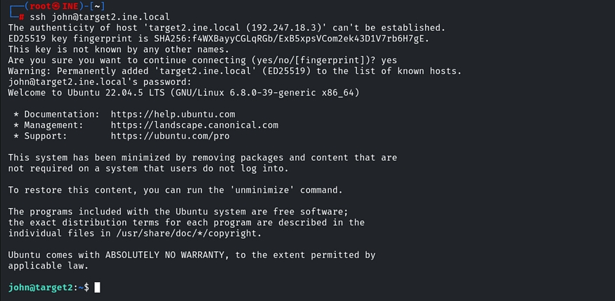 Port 22 is open. Let’s connect to the john user via SSH using the command: