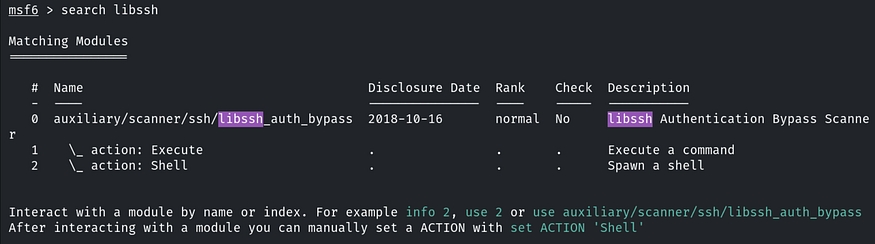 The scan reveals that port 22 is open, and the libssh service is running. To find an exploit for libssh in Metasploit, we use the command: search libssh