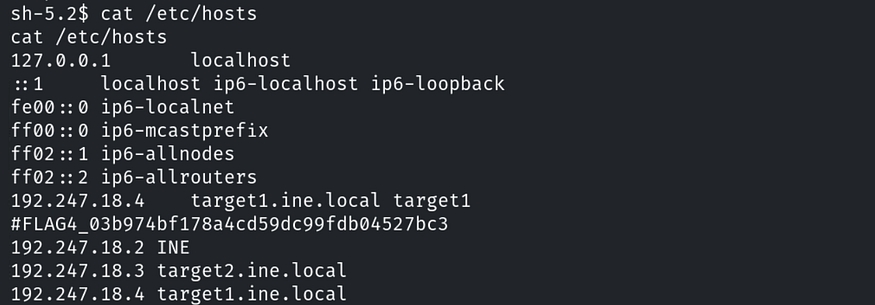 This file does not contain a flag, but it points to the host configuration. Let’s navigate to the hosts file using the command: cat /etc/hosts. Here, we have found our fourth flag.