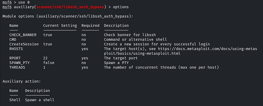 To use this module, type use 0, then enter options to list the required parameters for the exploit.