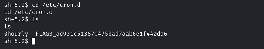 To find this flag, we need to enumerate the cron jobs, which are located in the /etc directory. After enumeration, the third flag is found in the /etc/cron.d directory.