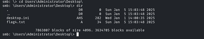 Finally, for the last flag, the question mentions that we need to enumerate the Desktop directory. Let’s navigate to that directory using the following command:cd Users\Administrator\Desktop\
