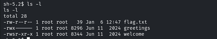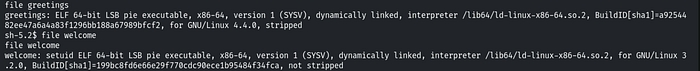 To obtain our last flag, we need to elevate our privileges. As we observed while obtaining the third flag, the user directory contains two additional files: ‘greetings’ and ‘welcome.’ By using the file command, we can confirm that both are binaries. We can utilize these binaries to escalate our privileges.