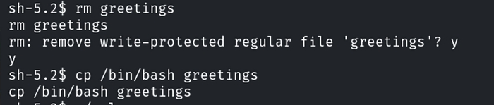 Our payload is: cp /bin/bash greetings, which will copy the Bash shell into the 'greetings' binary, allowing us to execute it with elevated privileges.