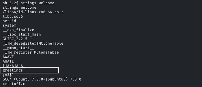 After examining the output, we discovered that the ‘welcome’ binary uses the ‘greetings’ binary, as shown in the image above.