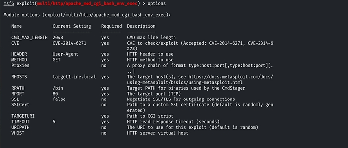 Upon running the check, we find that the website is indeed vulnerable to the Shellshock exploit. Now, let’s proceed by exploiting this vulnerability using another Metasploit module:
