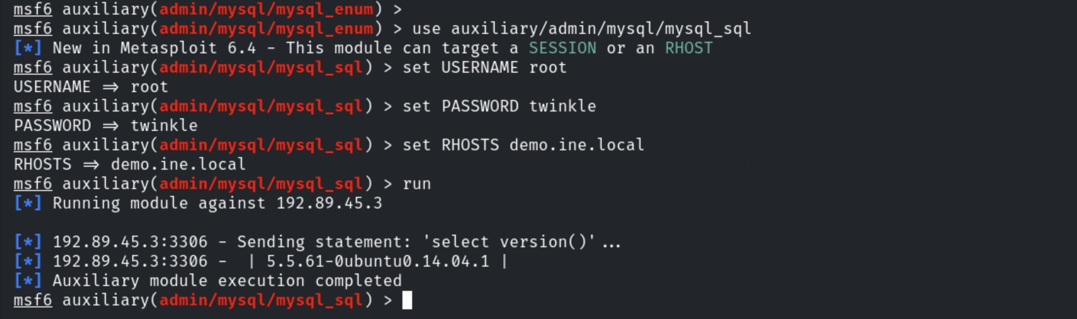use auxiliary/admin/mysql/mysql_sql