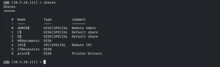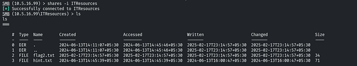 We don’t have access to the HRDocuments share. Let's connect to the ITResources share by using the command: shares -i ITResources. Then, use the ls command to list the contents of the directory.