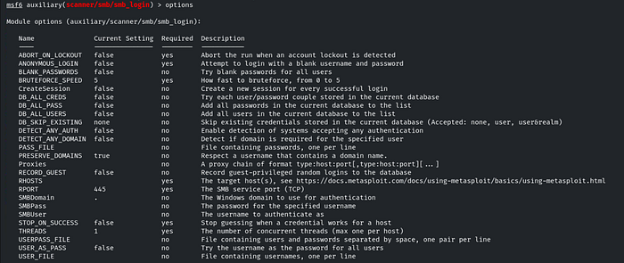 Now, set the following options for the Metasploit module scanner/smb/smb_login: