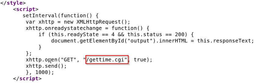 As shown in the following screenshot, the source code of the webpage contains a JavaScript block that is executing a CGI script called gettime.cgi.