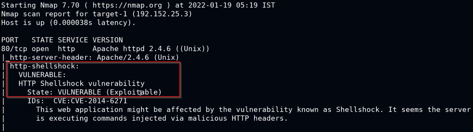 As shown in the following screenshot, the Nmap script scan reveals that the web server running on the target is vulnerable to the ShellShock exploit.